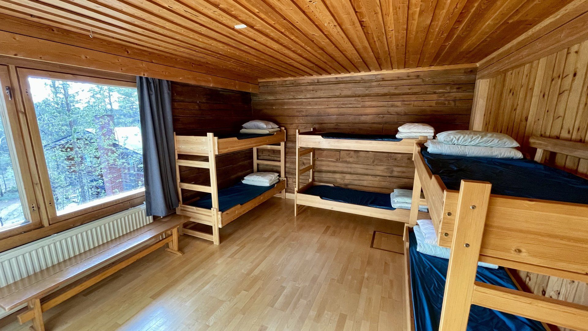 The exterior of the logging cabin now houses accommodations for 12 people. There are two chambers in the cabin, each with bunk beds for six occupants. Additionally, the building includes a Pirttisali, which can be used for lectures and teaching purposes.